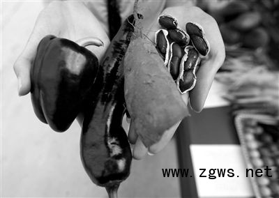 2009年9月24日,顺义北务镇,女孩在展示蔬菜大棚中的紫色辣椒、番薯和花生。资料图片王申摄