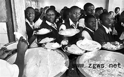10月16日,在肯尼亚首都内罗毕共和国高级中学,学生们在食堂打饭。