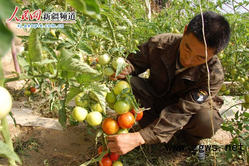 人民网哈巴河10月16日报道:(实习记者姬新悦通讯员谢师民)近日,新疆阿勒泰地区哈巴河县加依勒玛乡玛依沙斛村菜农陈生虎正在自己的大棚地里为采摘蔬菜作准备。进入十月以来,他种植的反季节西红柿、黄瓜、芹菜等蔬菜已全面上市。保守估计,每个大棚还将为他增加近1万元的收入。
