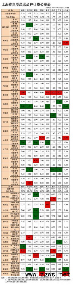 东方网10月24日消息:上海市价格监测与成本调查队今日发布《上海市部分农贸市场和超市主副食品价格公布表》。今日农贸市场8种蔬菜平均零售价格5涨3跌。其中跌幅居前的是青菜和菠菜,分别下跌4.5%和3.8%;涨幅居前的是冬瓜和黄瓜,分别上涨1.7%和1.4%。绿叶菜中,青菜价格1.28元/500克,鸡毛菜价格2.28元/500克。(全市50多家菜场超市蔬菜价格:点大图查看)
